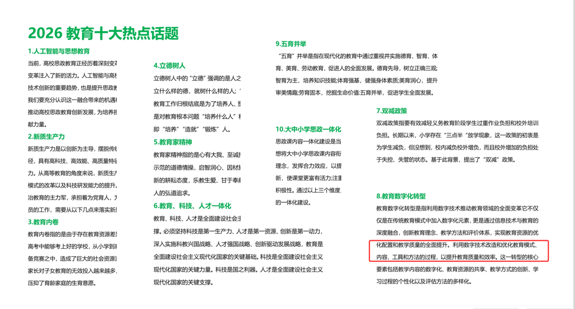 近日,全网推出了2026 年教育十大热点话题,其中有4点和科技相关,且第8条是教育数字化转型,强调要利用数字技术改造和优化教育模式、内容、工具和方法的过程,以提升教育质量和效率。