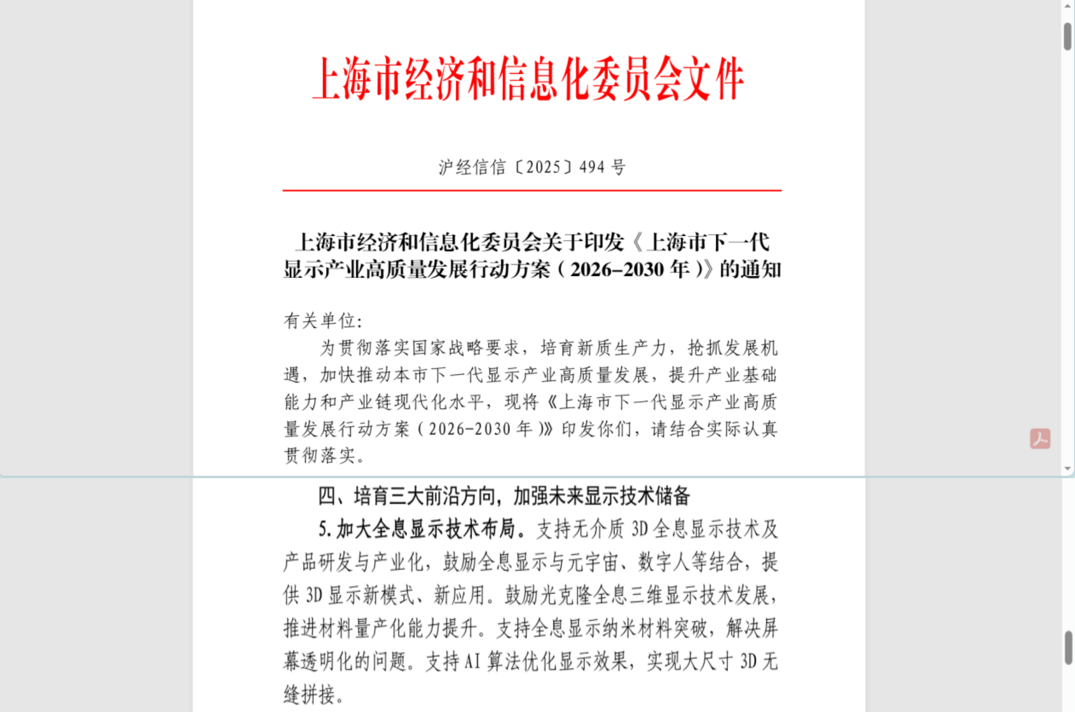 2025年7月,上海市正式发布了 《上海市下一代显示产业高质量发展行动方案》 ,前瞻性地将全息显示列为重点发展的三大前沿方向之首。此次先行部署不仅精准契合了国家最新的产业战略方向,也为本土创新企业提供了坚实的区域生态支撑,凸显了上海培育未来产业核心竞争力的决心。